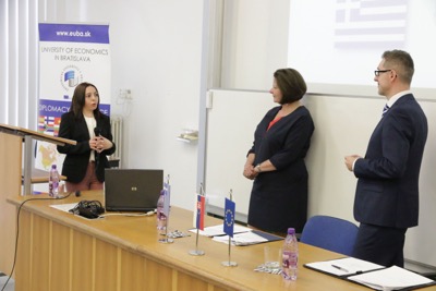 Veľvyslankyňa Helénskej republiky na Slovensku, J.E. p. Maria Louisa MARINAKIS, prednášala dňa 17. apríla 2018 v rámci predmetu Diplomacia v praxi. O spolupráci EU v Bratislave s univerzitami v Grécku hosťa informovali Boris MATTOŠ, prorektor pre medzinárodné vzťahy a Andrea VALACHOVÁ, prodekanka pre zahraničné vzťahy a styk s verejnosťou NHF EU v Bratislave.Na stretnutí bola prítomná aj študentka z University of Macedonia, ktorá aktuálne stážuje na gréckom veľvyslanectve v Bratislave.