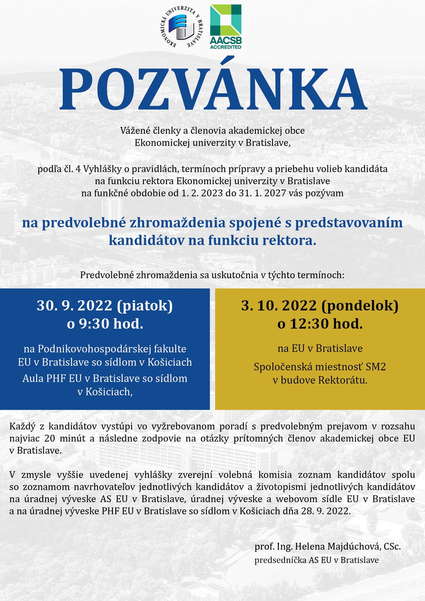 podľa čl. 4 Vyhlášky o pravidlách, termínoch prípravy a priebehu volieb kandidáta na funkciu rektora Ekonomickej univerzity v Bratislave na funkčné obdobie od 1. 2. 2023 do 31. 1. 2027 Vás pozývam