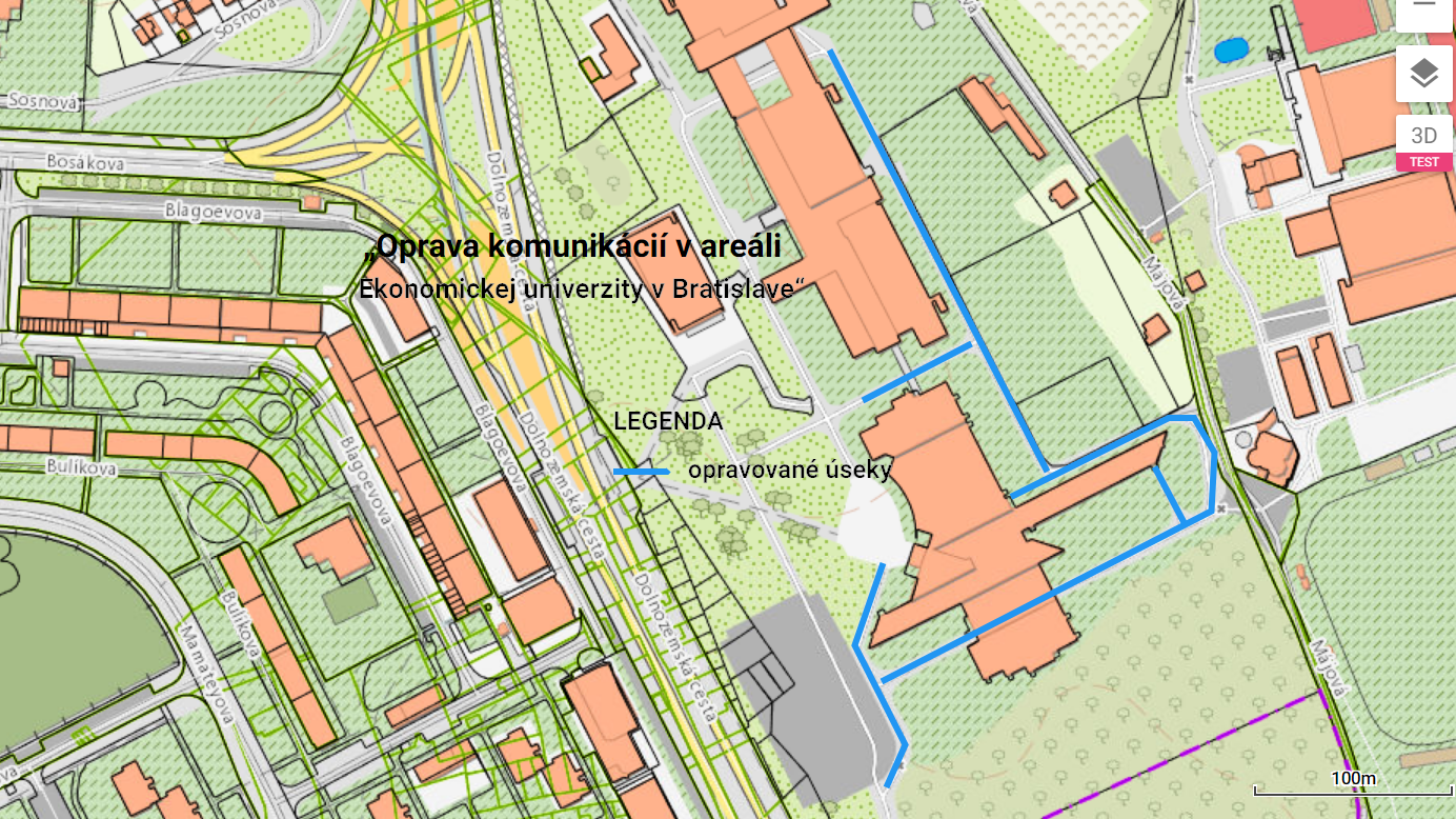 Ekonomická univerzita v Bratislave v predstihu uskutočňuje rekonštrukciu vnútroareálovej asfaltovej komunikácie od križovatky Dolnozemská cesta – Májová ul. až po koniec budovy V – 1 a to podľa priloženej výkresovej dokumentácie a harmonogramu prác v dňoch. Rekonštrukcia prebieha v termíne od 14. 4. 2020 do 4. 5. 2020.
