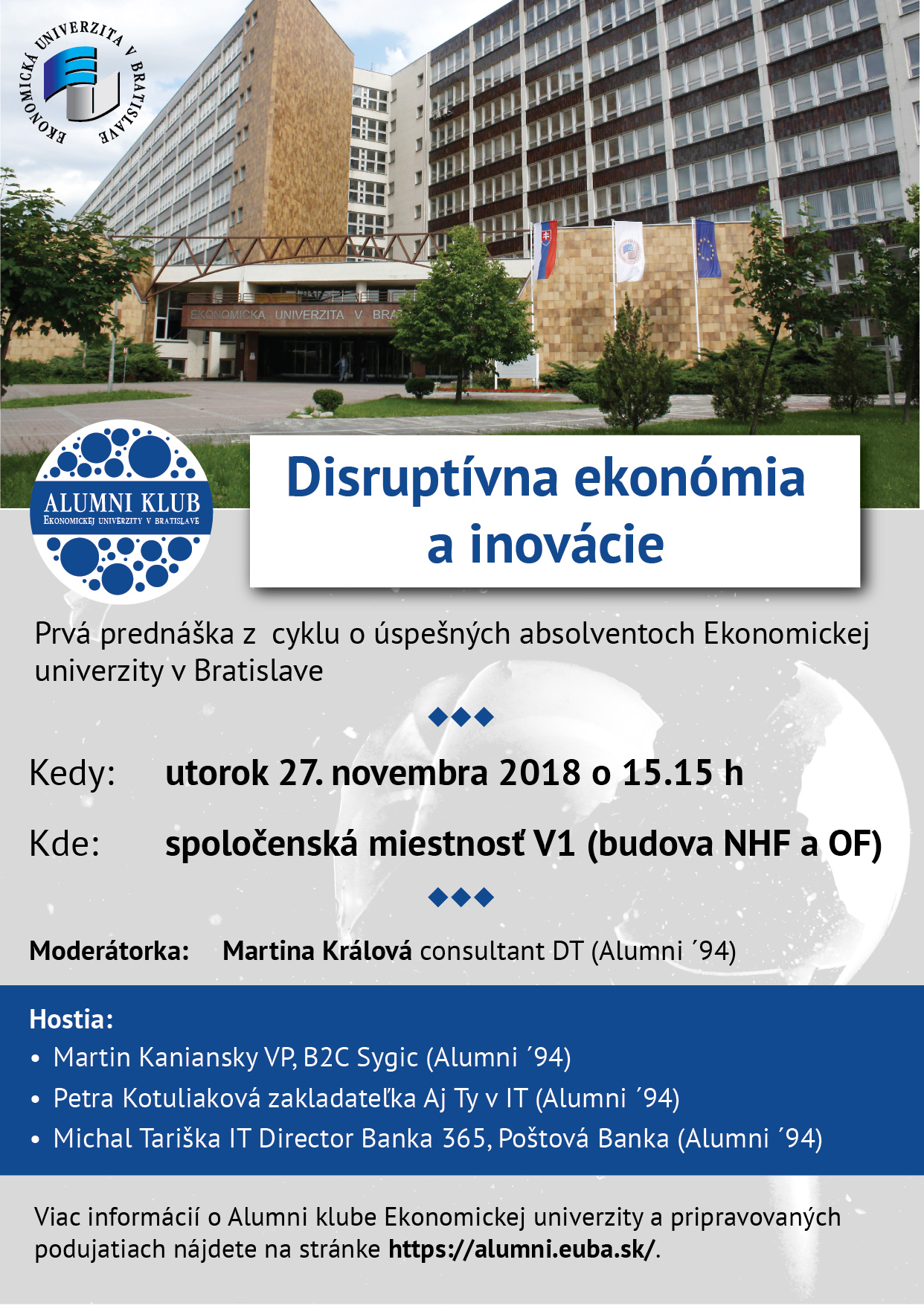 Pozývame študentov a zamestnancov EU v Bratislave na prvú prednášku z cyklu o úspešných absolventoch Ekonomickej univerzity v Bratislave, ktorá sa uskutoční v utorok 27. novembra 2018 o 15.15 h v spoločenskej miestnosti V1 (budova NHF a OF).